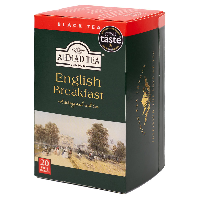 Ahmad Tea English Breakfast. Klasyczna czarna herbata śniadaniowa o intensywnym, bogatym smaku, zamknięta w hermetycznej kopercie aluminiowej. Idealna na dobry początek dnia, świetnie smakuje również z mlekiem.