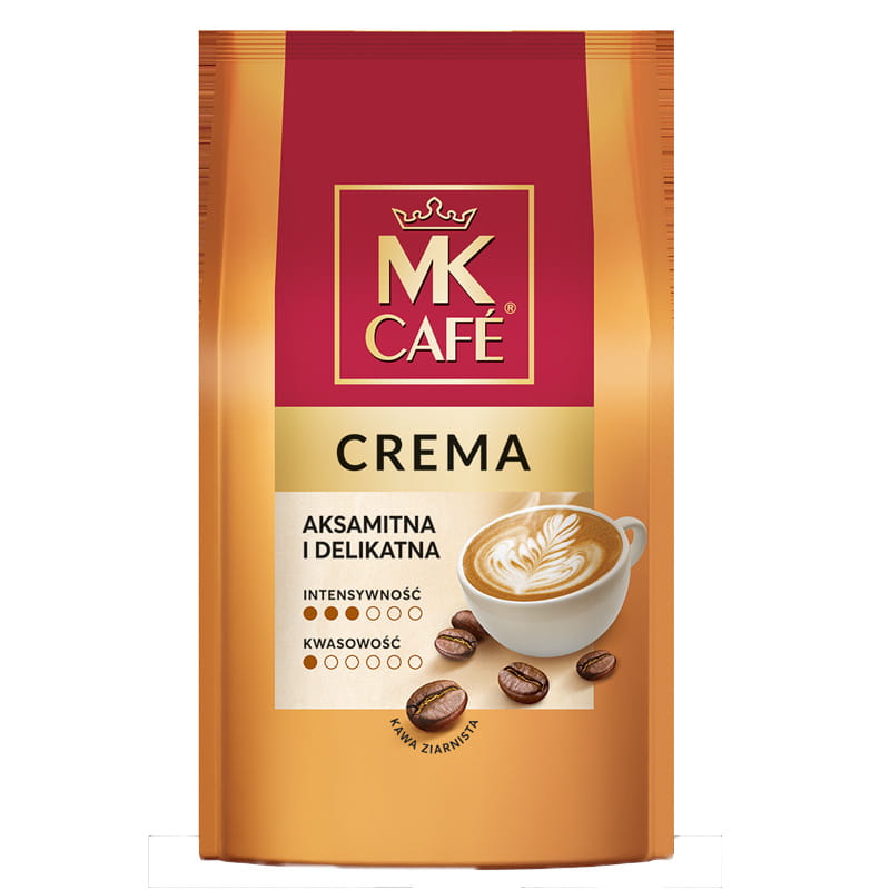 Kawa ziarnista MK Cafe Crema. Polecana przez baristów unikalna kompozycja ziaren stworzona specjalnie do przygotowania idealnego cappuccino. Połączenie delikatnej i pełnej słodyczy Arabiki uprawianej w Ameryce Południowej z azjatycką Robustą daje świetny balans i aksamitne body – idealne do każdego rodzaju i stylu picia kawy.