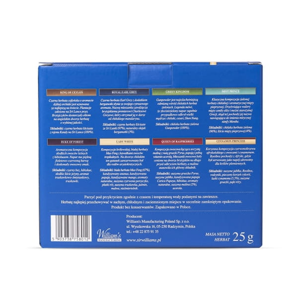 - Skład: King Of Ceylon, Royal Earl Grey, Green Kingdom, Mint Prince, Duke Of Forest, Lady White, Queen Of Raspberries, Cinnamon Princess.