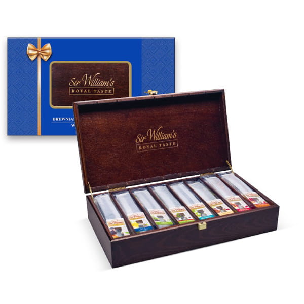 Zawartość: drewniana skrzynka z ośmioma przegródkami na 8 smaków herbat Sir William’s Royal Taste, po 10 saszetek z każdego smaku: King of Ceylon, Royal Earl Grey, Green Kingdom, Lord Of Cherries, Mint Prince, Lady White, Queen of Raspberries, Cinnamon Princess.